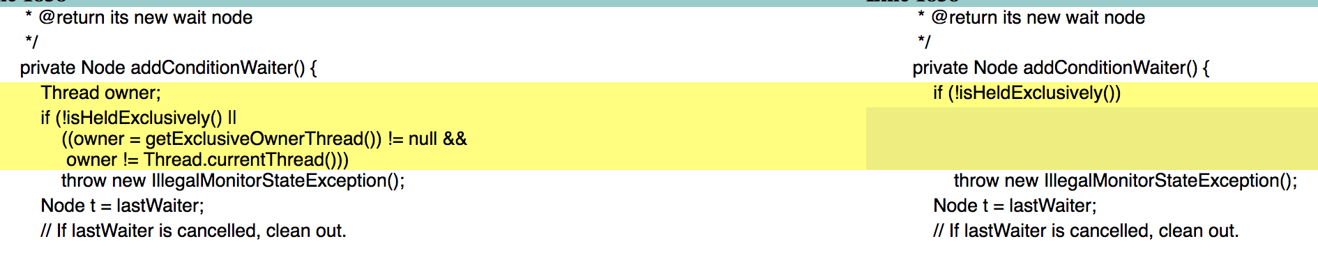 和我自己预期的修复方法一样,不就这么一句话就搞定的事情么。 另外他们也修了一下isHeldExclusively的JavaDoc注释,指出isHeldExclusively会被所有ConditionObject方法调用到。