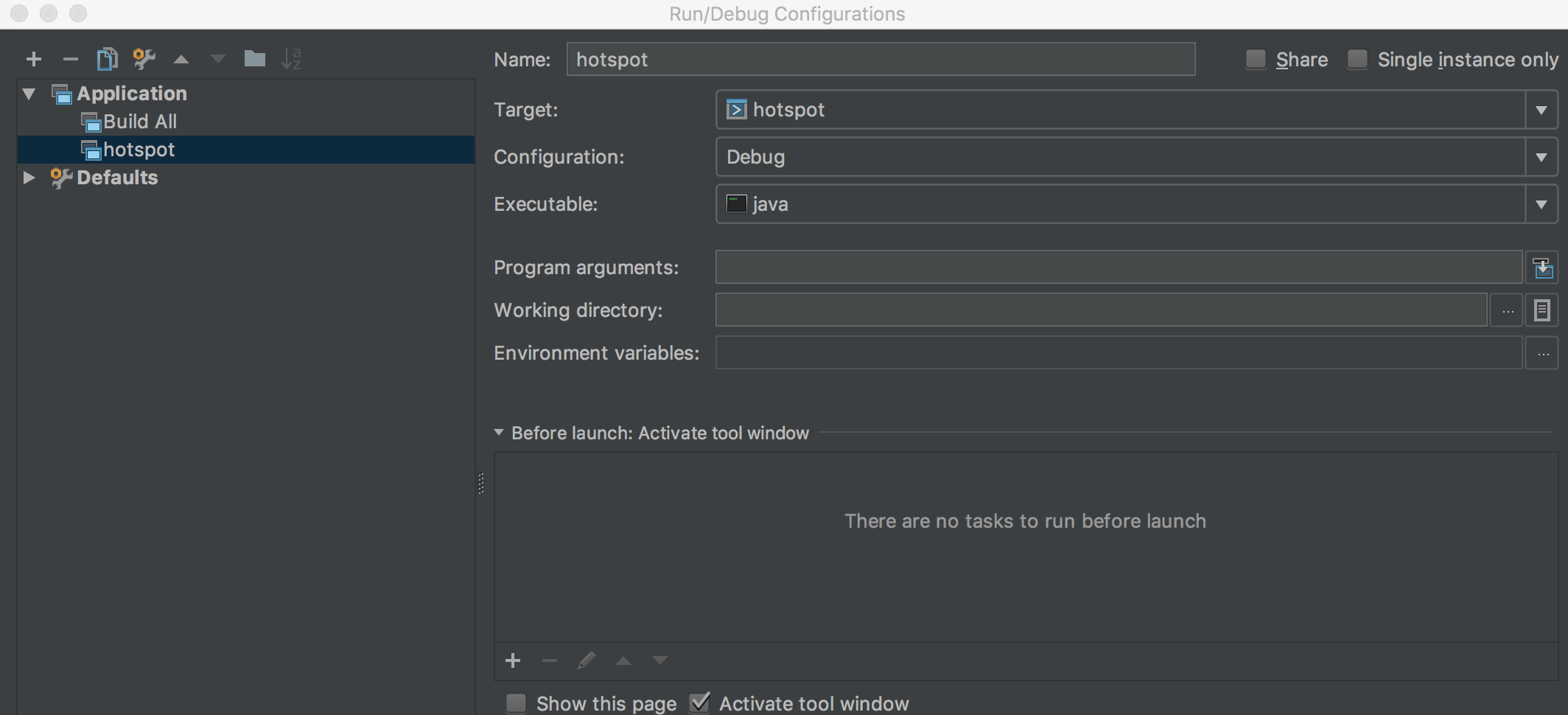 加上一个调试hotspot的配置,在这里的Executable选择我们编译出来的jdk的java程序,路径如OpenJDK路径/build/macosx-x86_64-normal-server-fastdebug/jdk/bin/java